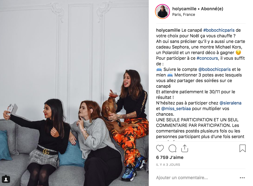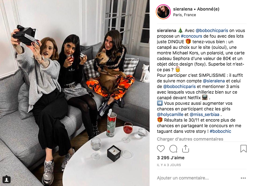Deux influenceuses : @Holycamille et @Sieralena ont relayé le jeu concours valable du 26 au 30 Novembre, via une publication Instagram.